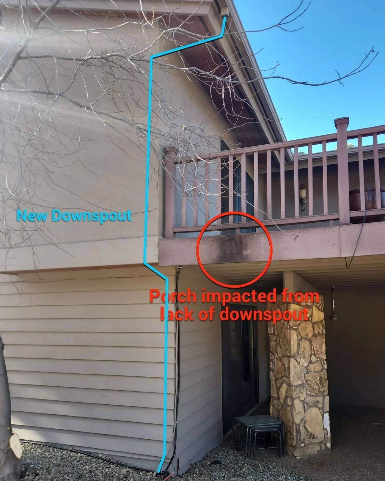 In this recent Flagstaff project, the homeowner contacted us after noticing water damage developing on their patio due to runoff and leaking gutter sections.